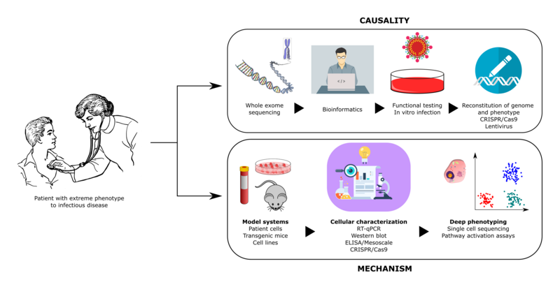 Influenza infection is common worldwide with many individuals affected during epidemics and pandemics. Previous studies have established an essential role for innate immune responses, and in particular the production of Type I and III interferon (IFN), for viral elimination and survival from influenza infection in vitro and in animal models. However, genetic and immunological determinants of very severe disseminated influenza infection in humans remain poorly characterized. In 2015, the first report of a primary immunodeficiency involving IFN regulatory factor (IRF)7 in a child with severe disseminated influenza was published. Subsequently our group and others have described defects in innate receptors of cytosolic dsRNA, including TLR3 and RIG-I, as well as defective signaling by the transcription factors IRF3, IRF7 conferring susceptibility to severe influenza. In this project, we will collect a cohort of young adult patients admitted to the intensive care unit (ICU) with severe influenza A virus (IAV) H1N1 and perform whole exome sequencing (WES) to identify potentially disease-causing genetic variants. This will be followed by functional immunological and virological analyses to examine innate antiviral immune responses in relevant cell populations from patients. The impact of variants will also be investigated in HEK 293T cells made devoid of the molecule of interest to compare IFNβ-reporter activity when transfecting wild-type (WT) and mutant protein-encoding plasmids into cells. Finally, we will perform reconstitution experiments on patient cells to demonstrate reversion to the normal phenotype by the introduction of the WT protein in question. This is aiming at establishing a direct causal association between the gene variant identified by WES, the immunological phenotype of patient cells and the clinical presentation of the patient.
